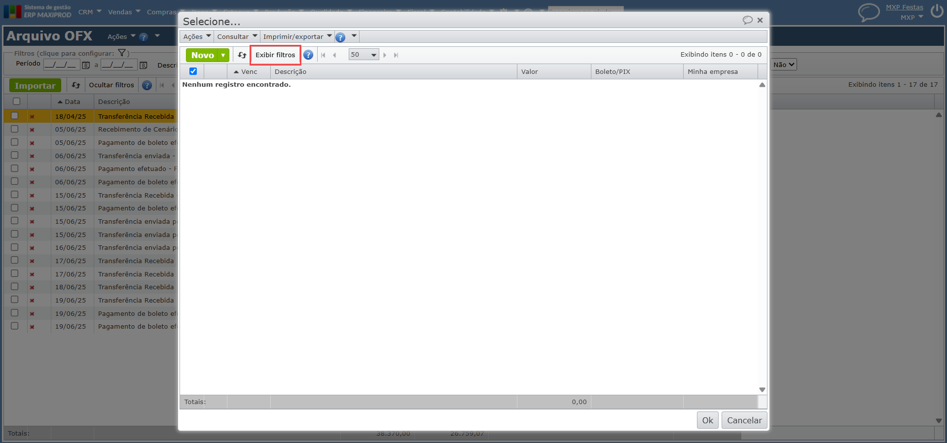 4) Isso ocorre, porque o filtro “Valor líquido” é inicializado com o valor do registro OFX, que não é necessariamente o valor do título. Para contornar esta situação, clique em “Exibir filtros”.