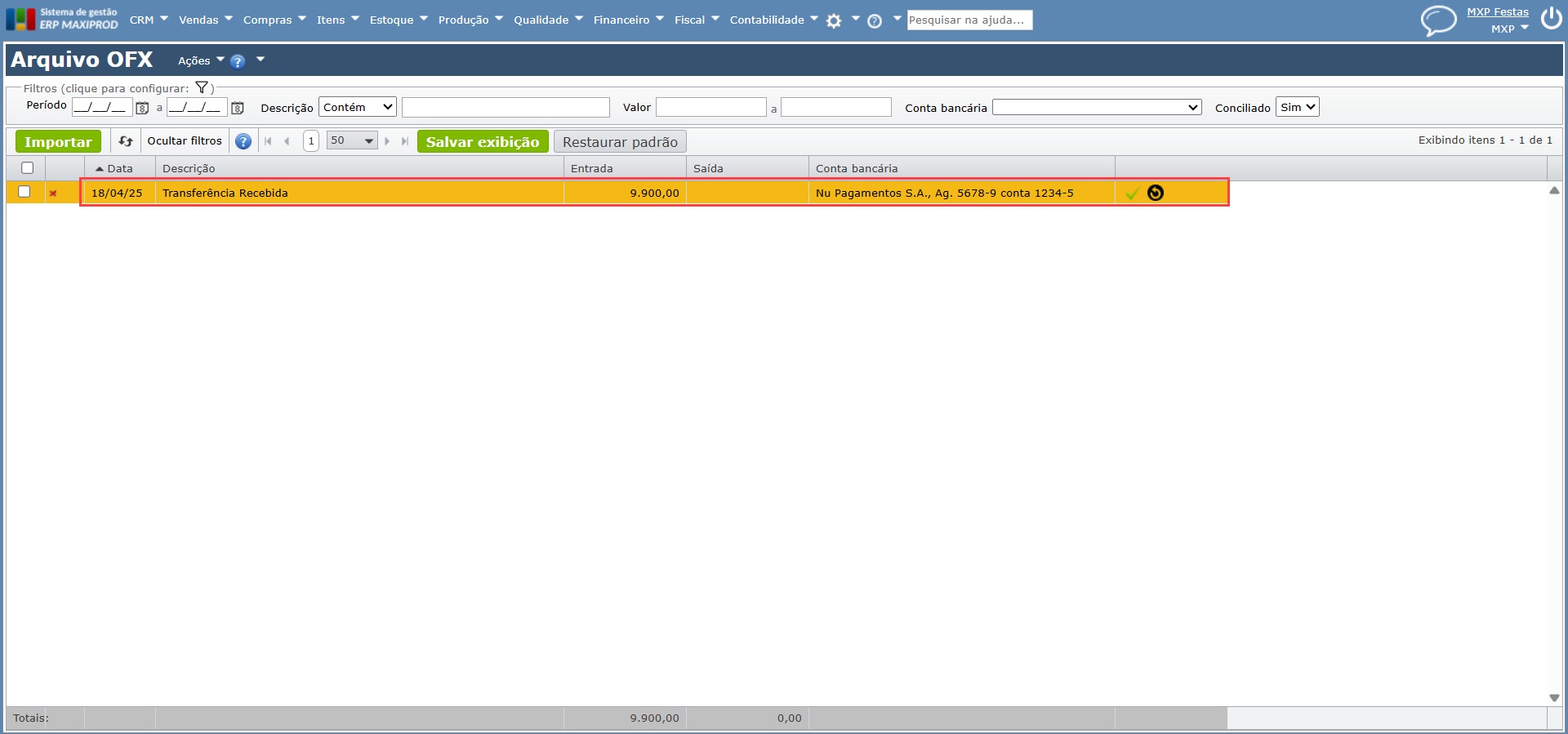 1) Na tela “Financeiro > Importar OFX”, aparece o registro de entrada de R$ 9.900,00, que não foi conciliado automaticamente.