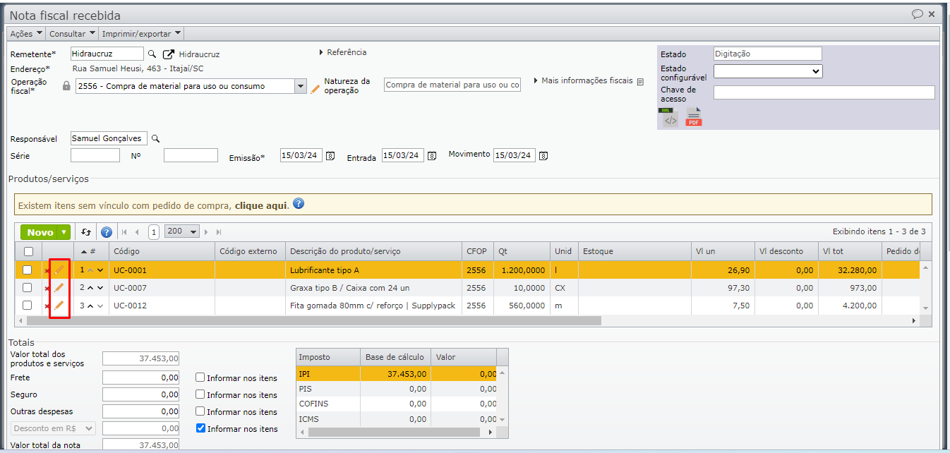 2) Antes de emitir ou receber a NF, abra a tela de edição do item cuja conta de débito será alterada, clicando no ícone do lápis: