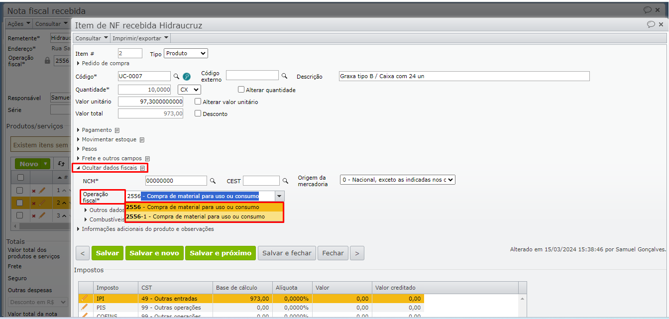 4) Se foram criadas diferentes operações fiscais com o mesmo CFOP, a alteração pode ser feita na tela de edição do item da nota. Após “Salvar” a alteração do item, os dados do item serão alterados conforme sua operação fiscal. Clique aqui e veja como itens de uma mesma NF podem ter diferentes configurações.