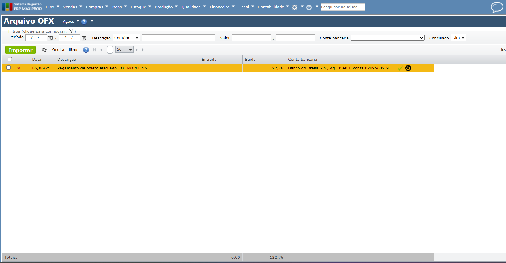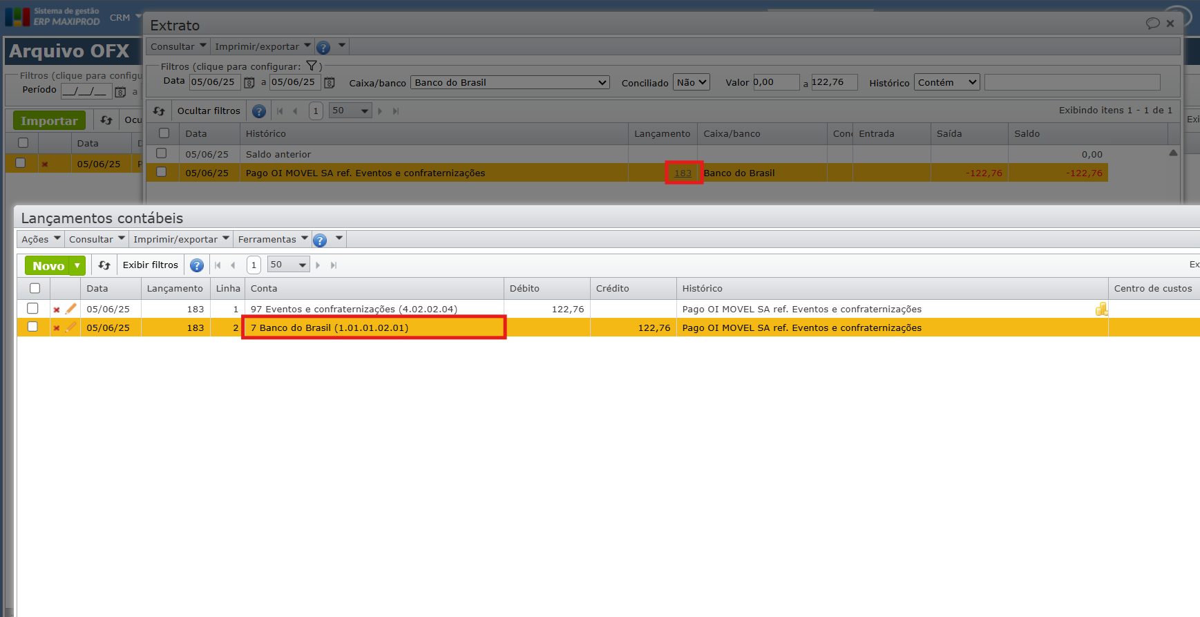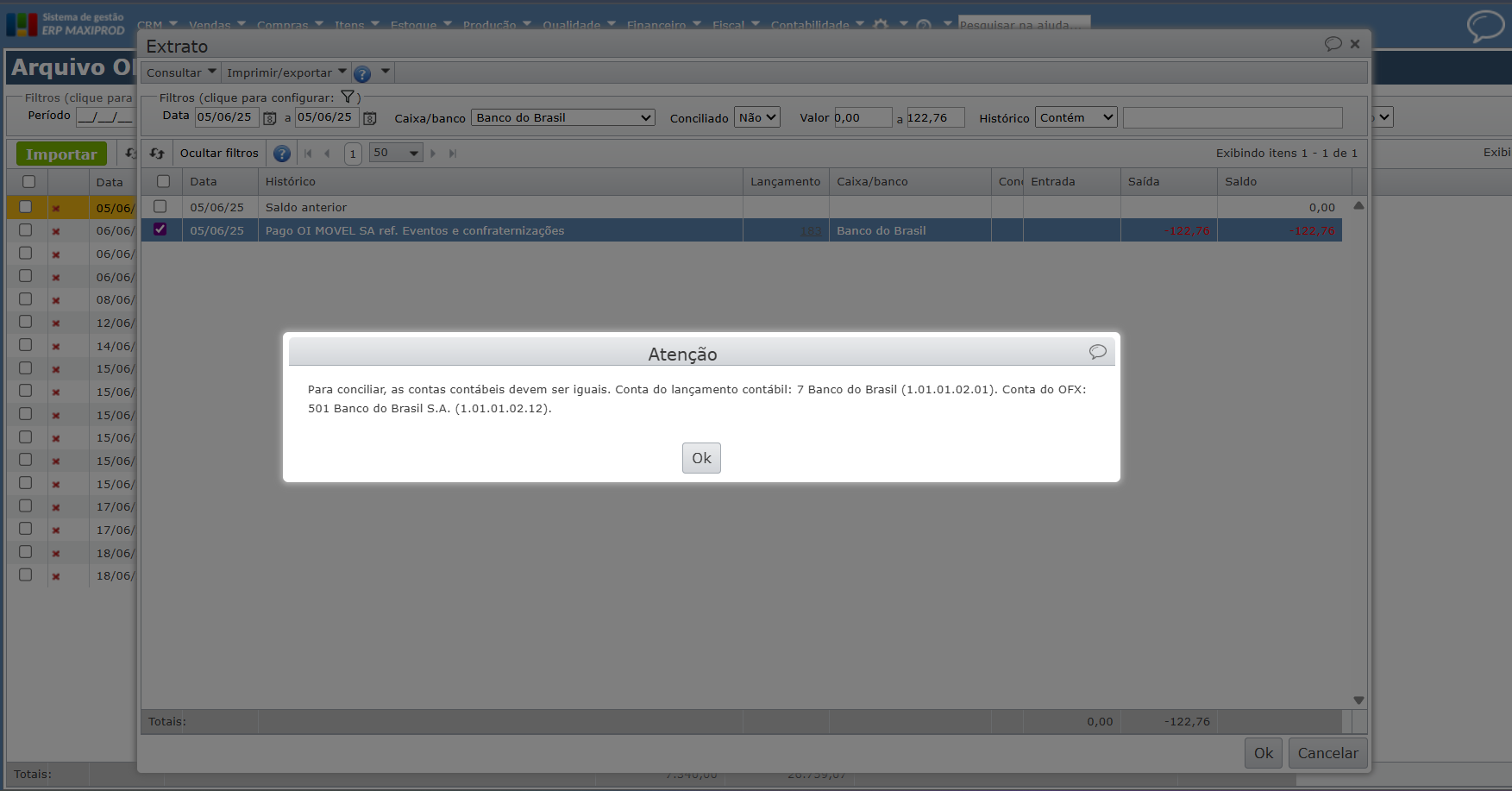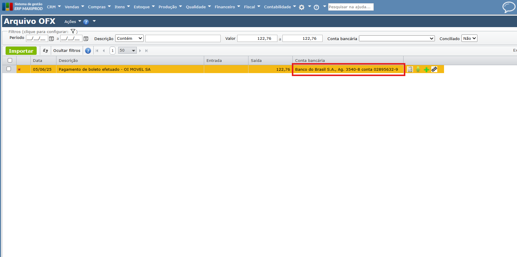 6) Agora o registro do arquivo OFX pode ser conciliado, pois a conta contábil usada na liquidação do título e, portanto, no lançamento, é a mesma da forma de cobrança/conta bancária.