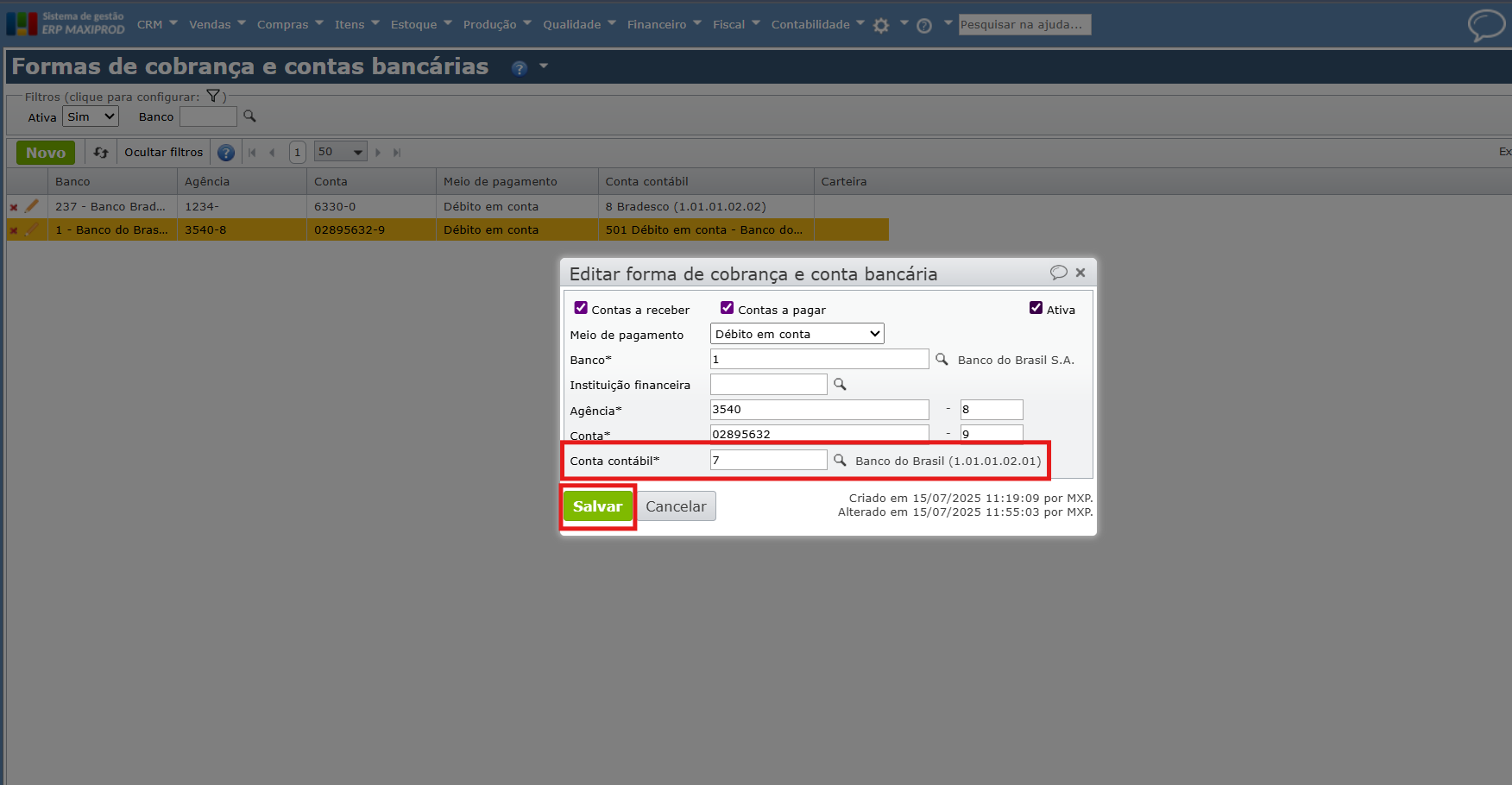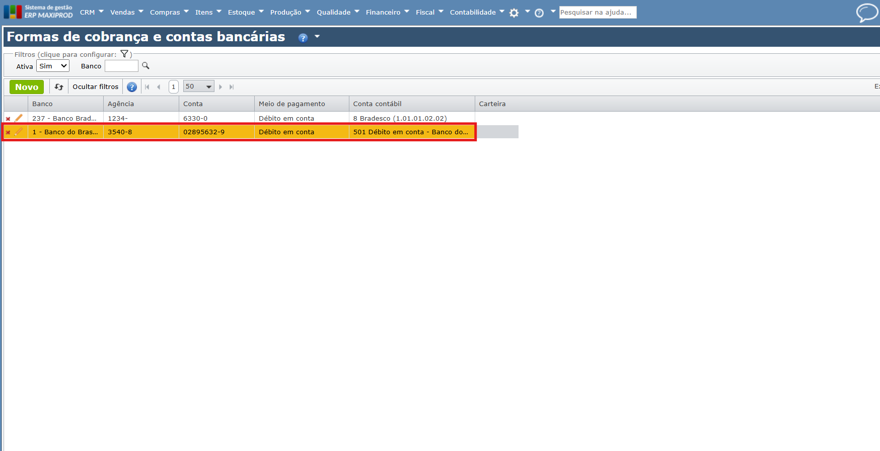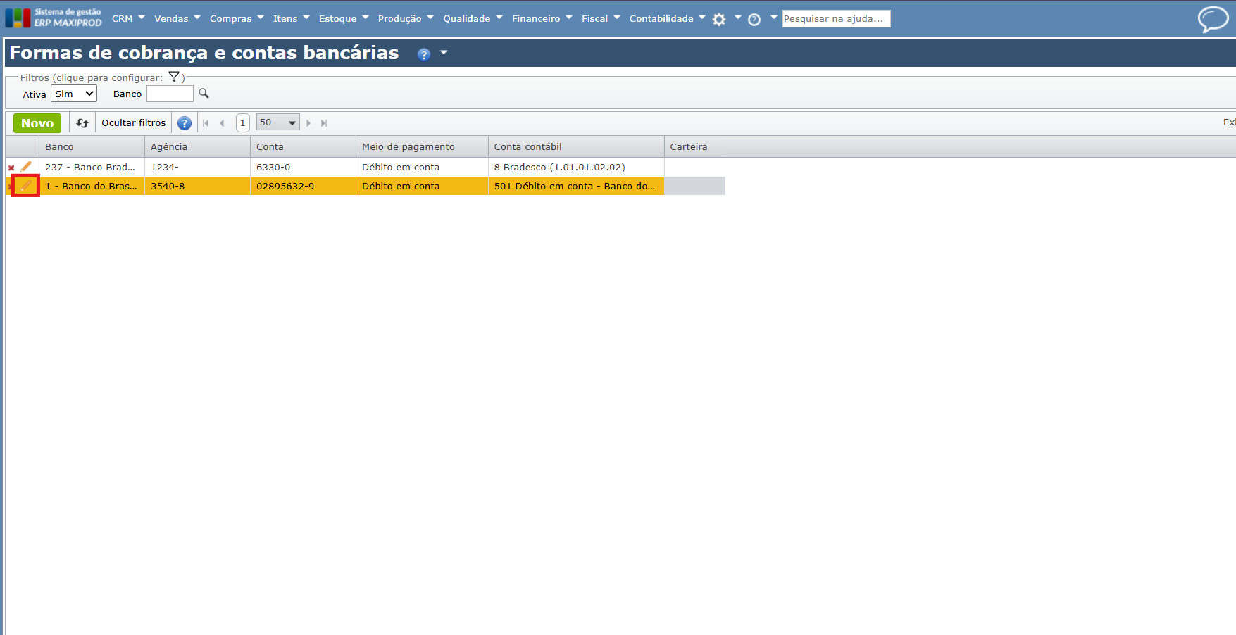 4) Para alterar a conta contábil vinculada a forma de cobrança/conta bancária, acesse a tela “Financeiro > Cadastros > Formas de cobrança e contas bancárias” e clique no ícone lápis laranja para editar.