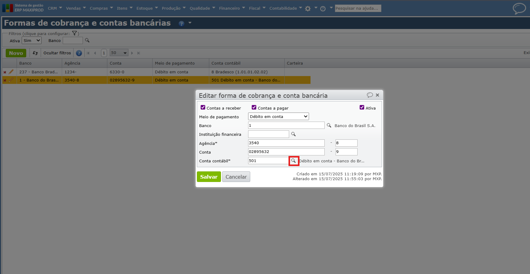 a) Na tela “Editar forma de cobrança e conta bancária”, ao lado do campo “Conta contábil”, clique no ícone de lupa para exibir as contas contábeis.