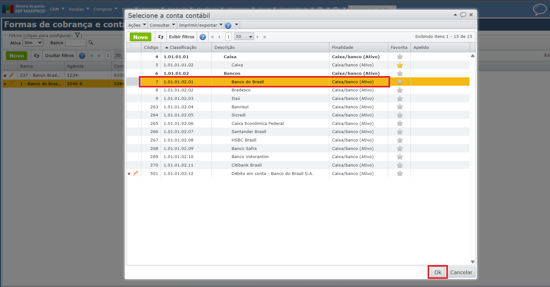 b) Selecione a conta contábil de forma que a linha fique destacada em laranja e clique no botão cinza “Ok”.