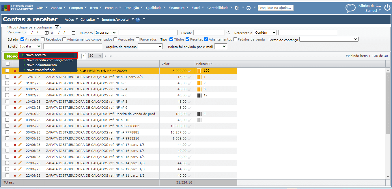 Na criação manual (não automática, resultante de NFs, por exemplo) de títulos a receber, há 2 opções:
