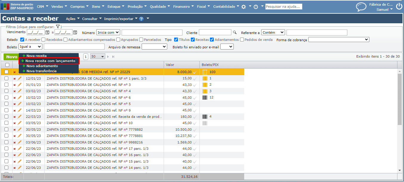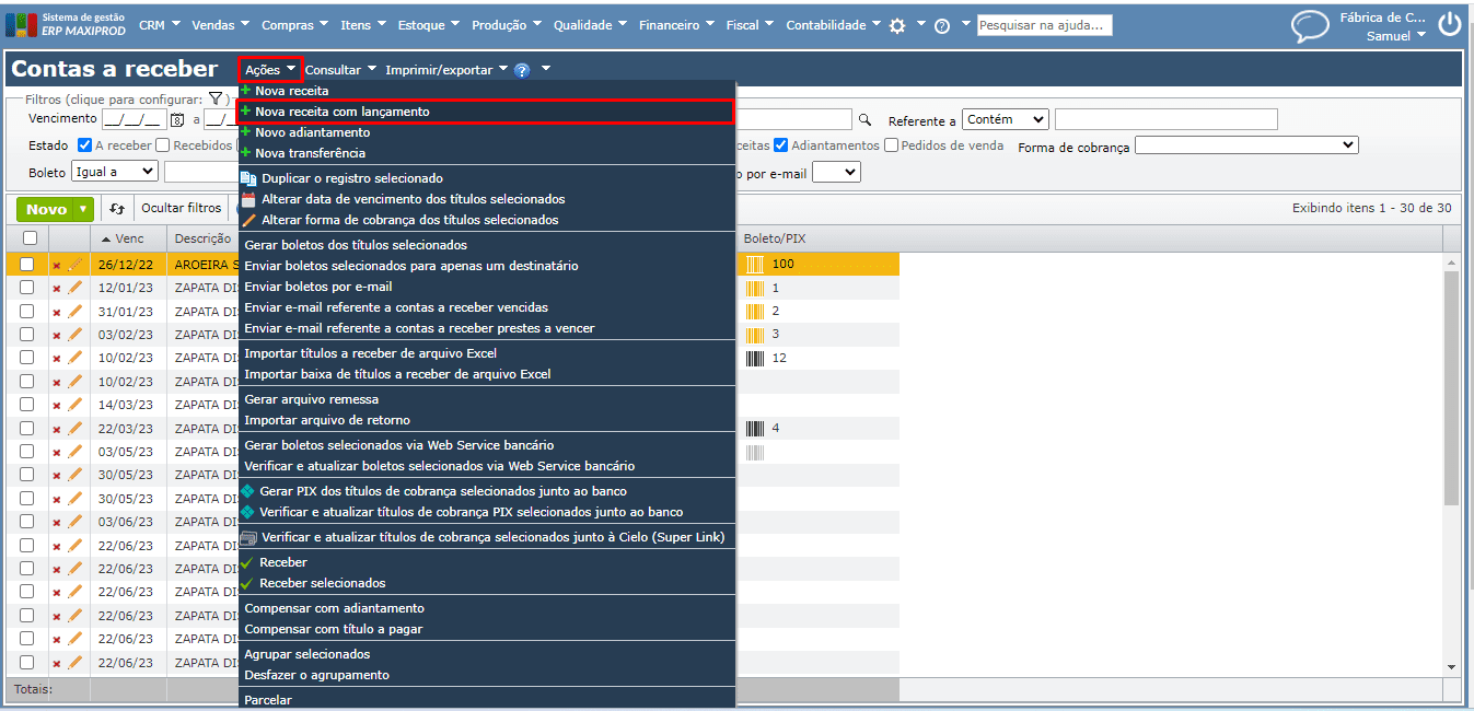 2) Através do menu “Ações”, ou das opções do botão verde “Novo”, pode-se usar a opção “Nova receita com lançamento”, que gera lançamentos contábeis tanto na criação da conta a receber, como na sua liquidação.