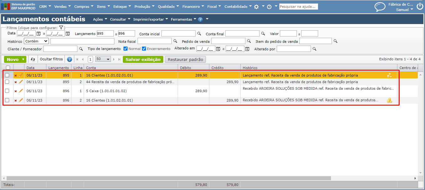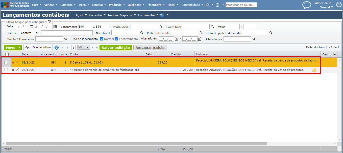 b) Veja a tela de lançamentos contábeis após receber uma “Nova receita com lançamento”.