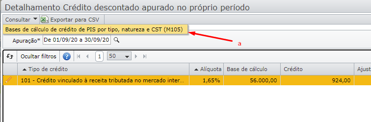 a) nesta tela de detalhamento exemplificada acima, deverá ser selecionada a linha de registro do código de contribuição dando um clique sobre ela (ela ficará com a tarja laranja), e clicar no menu “Consultar”, com a opção “Bases de cálculo de crédito de PIS por tipo, natureza e CST (M105)” para o PIS e a opção “Bases de cálculo de crédito de COFINS por tipo, natureza e CST (M505)” para o COFINS.