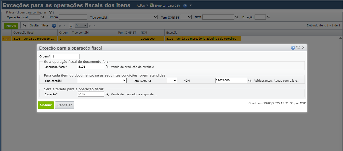 Atualmente, o ERP MAXIPROD disponibiliza o uso de exceções das operações fiscais para definir a operação fiscal que deve ser utilizada para determinada combinação de condições. Essa funcionalidade verifica a operação usada e, quando se enquadrar nas condições estabelecidas na exceção, utilizará outra operação fiscal.