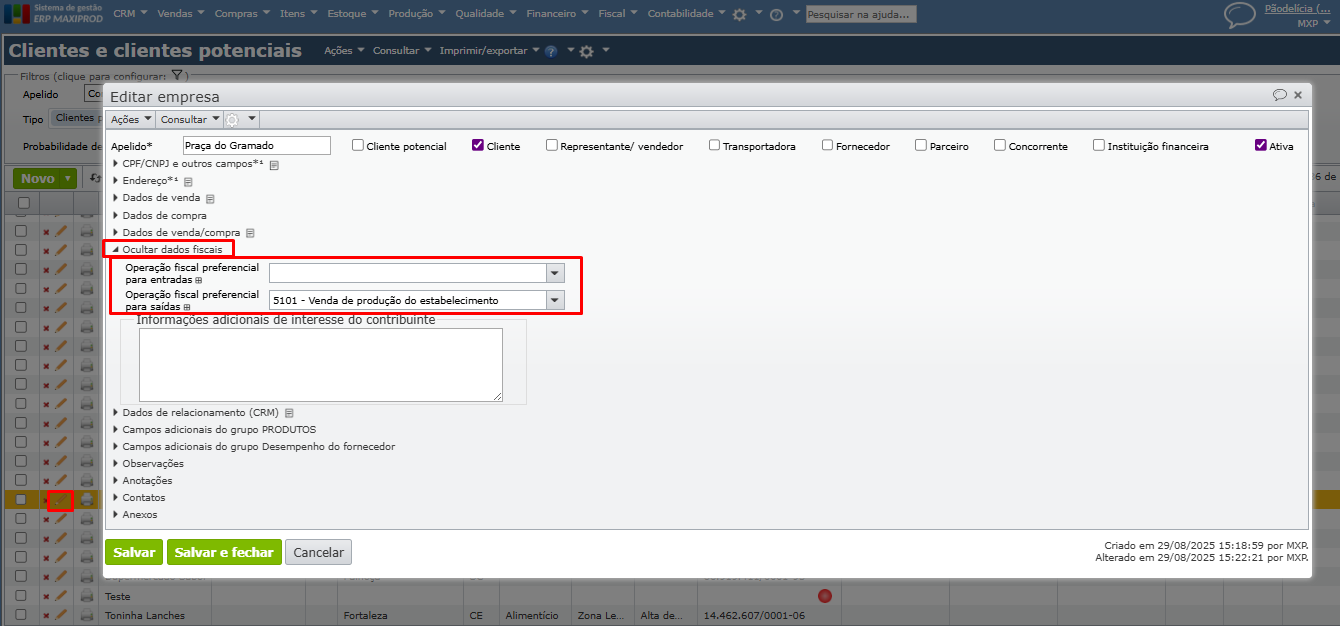 No ERP MAXIPROD, é possível parametrizar a inicialização de uma operação fiscal por empresa, seja ela um fornecedor, cliente, transportadora, ou outras. Essa configuração pode ser definida para cada um dos CNPJs no plano Multi-CNPJ.