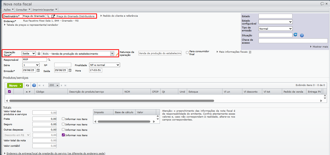 - Operação fiscal preferencial de saída: 5101.
