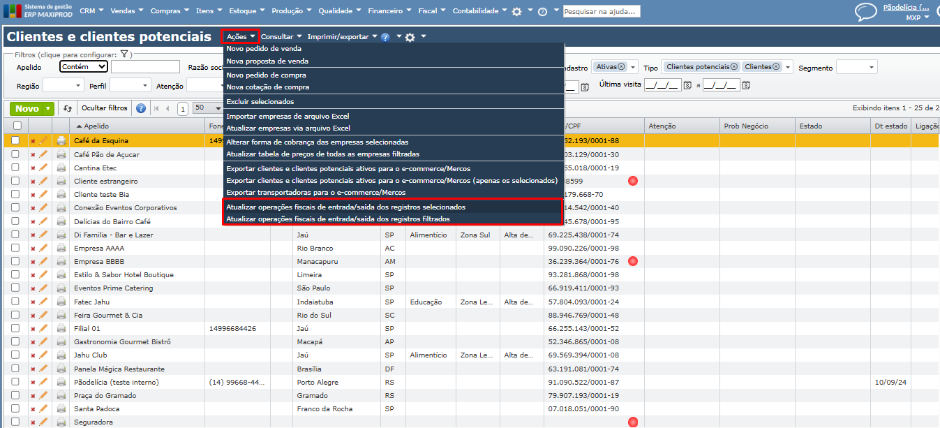 b) “Atualizar operações fiscais de entrada/saída dos registros filtrados”.