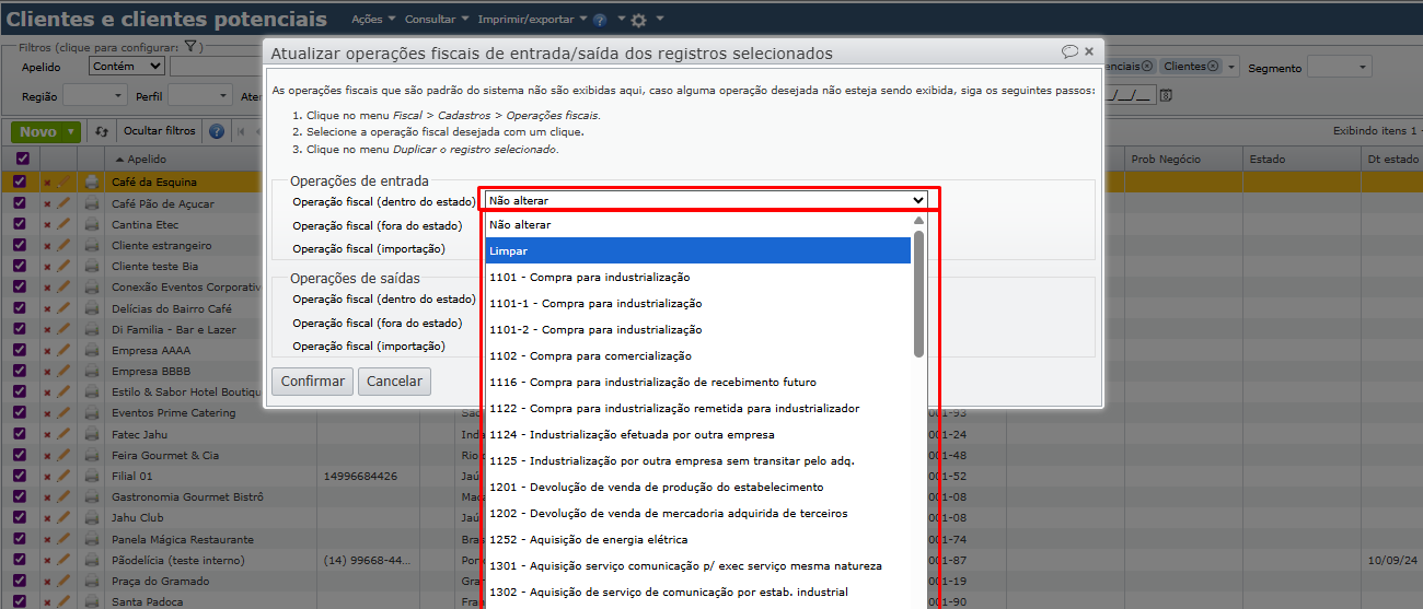 4) Para atualizar, pode-se informar uma operação fiscal, “Não alterar” ou “Limpar”.