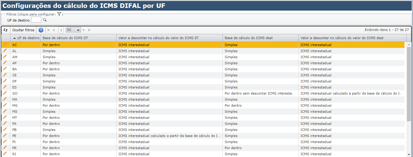Uma vez alterada a forma de cálculo, sempre que o sistema identificar uma operação que se enquadre na UF e nos respectivos impostos, o cálculo do imposto respeitará a forma configurada.