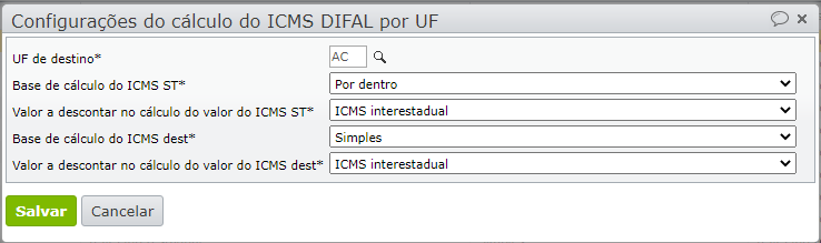 3) Para editar as configurações de alguma UF, dê um duplo clique sobre a linha da respectiva UF ou clique no ícone do lápis. A seguinte janela será aberta:
