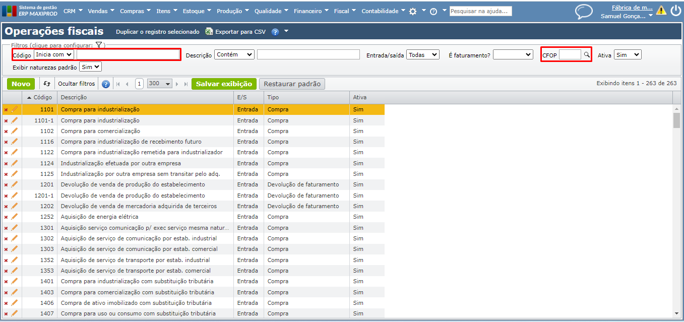 - Procure, por exemplo, alguma operação com o mesmo CFOP (Código Fiscal de Operações e Prestações).