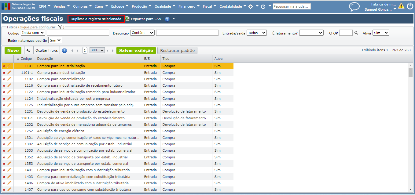 3) Com a operação fiscal selecionada, clique em “Duplicar o registro selecionado”.