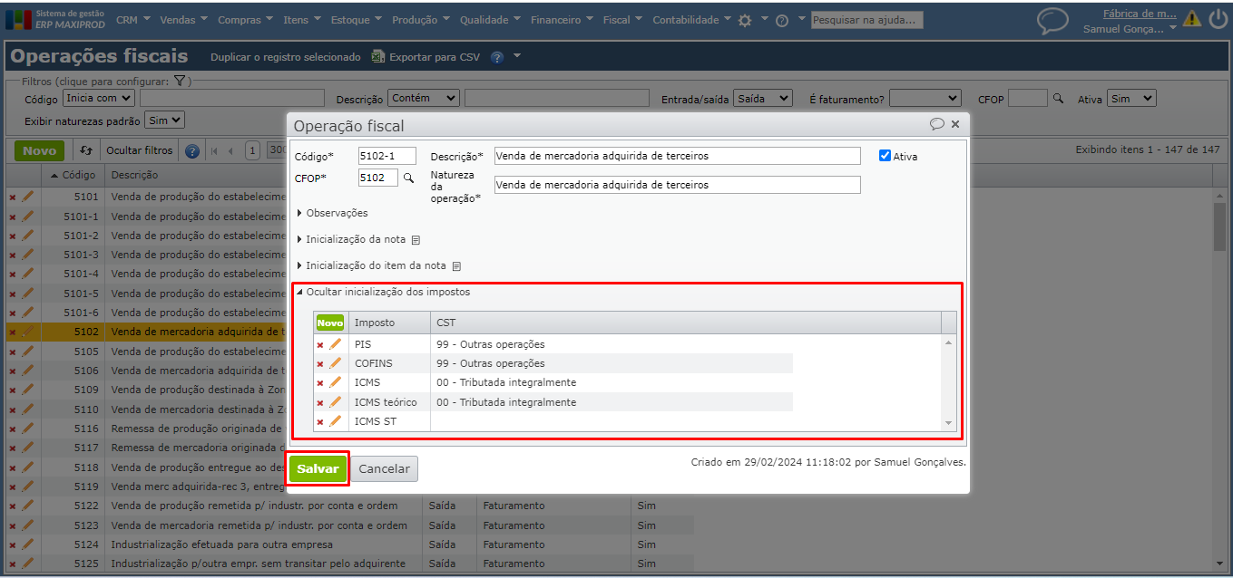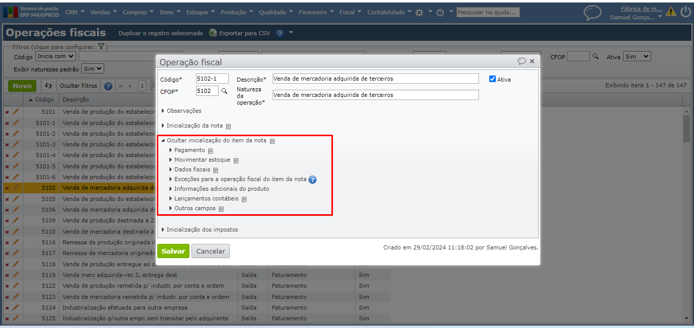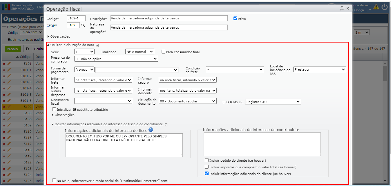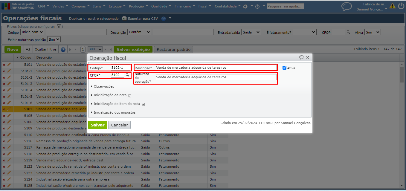 - o “Código” da nova operação fiscal e sua “Descrição” (o código da operação fiscal pode conter caracteres que incluem o código da CFOP).