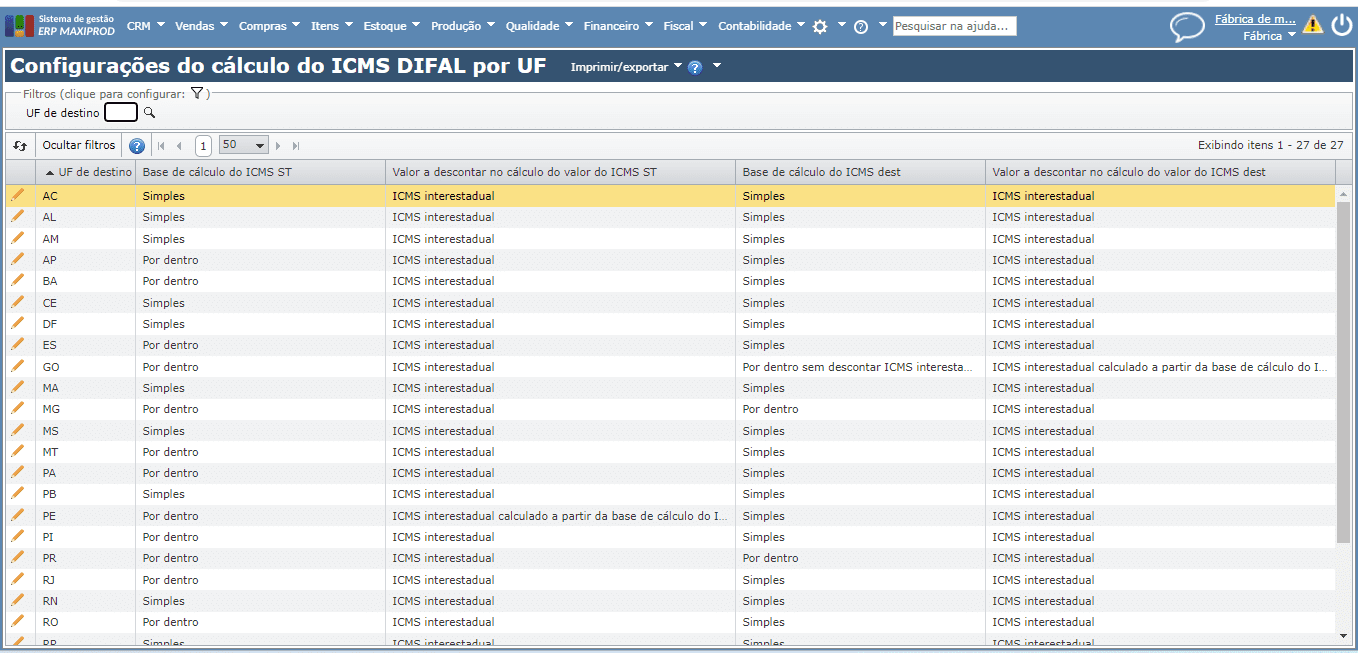 3) Na grade aberta, são exibidas todas as UFs na coluna “UF de destino” e a forma de cálculo para cada uma, com os seguintes pontos: