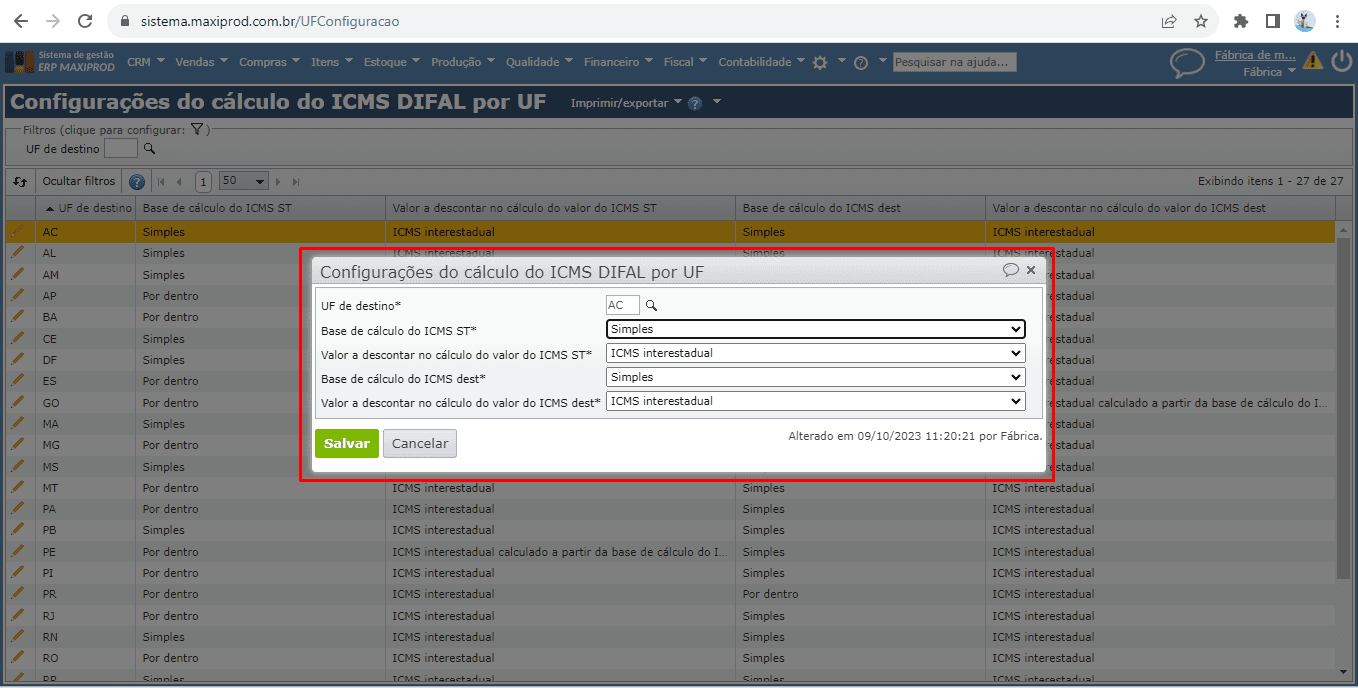 4) Para editar as configurações de qualquer UF, duplo clique a linha da respectiva UF ou clique no ícone do lápis. A seguinte janela será aberta: