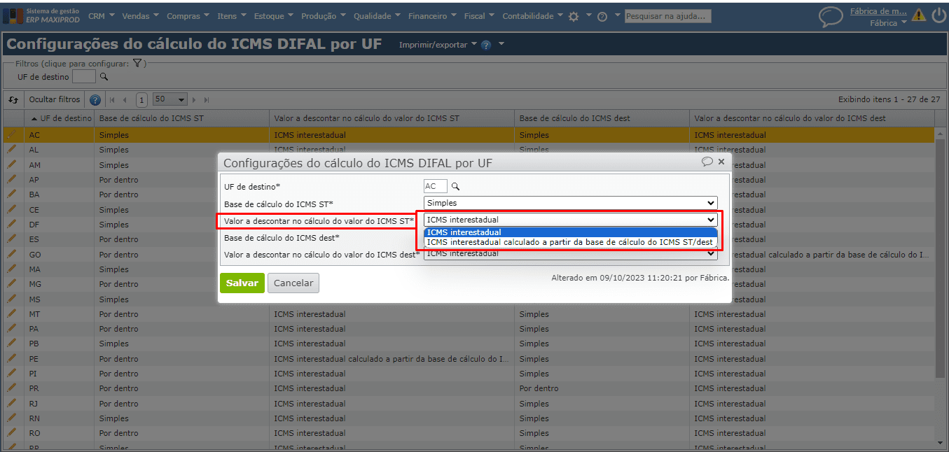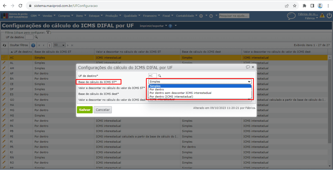 1) No ERP MAXIPROD a base de cálculo do ICMS-ST depende da configuração do cálculo por UF. O sistema já está preparado, por padrão, para o cálculo do ICMS ST com base na legislação de cada UF, mas permite que o assinante personalize a forma de cálculo do imposto.