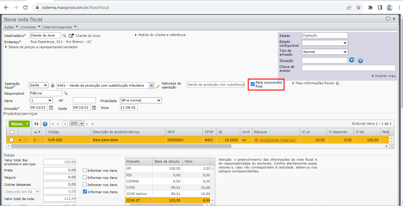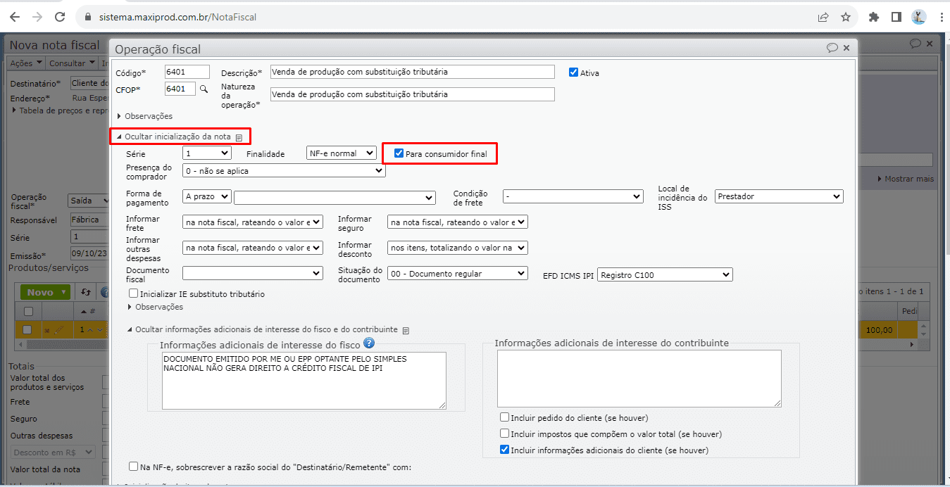 8) Tendo em vista que não há substituição tributária em relação ao consumidor final, na edição dos pedidos e/ou notas fiscais de operações que possuem substituição tributária, observe se a opção “Para consumidor final” está marcada.