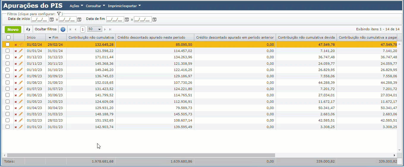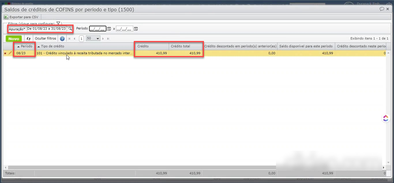 2) Se há saldo credor naquele período, selecione a respectiva apuração e acesse o submenu “Consultar > Saldos de créditos de PIS/COFINS por período e tipo (1100)” para ver os detalhes dos créditos do período.