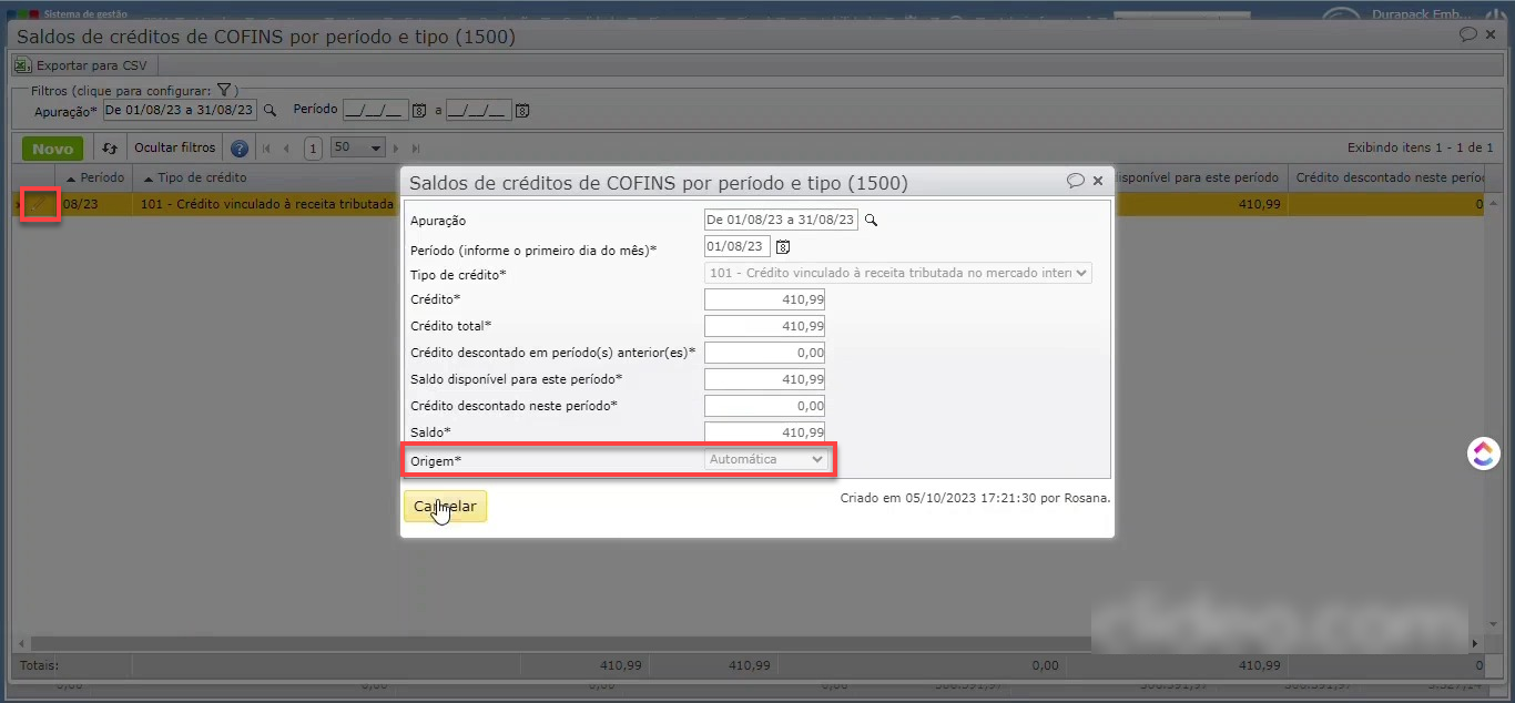 4) Clique no ícone do lápis ou duplo-clique sobre a linha para mostrar os detalhes do crédito. O campo “Origem”, por exemplo, indica se é automática ou manual.