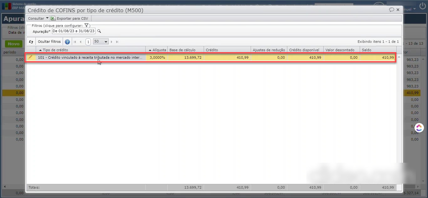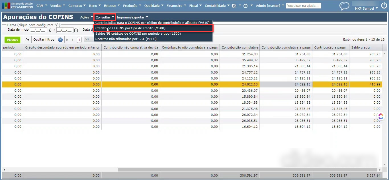 1) Selecione a apuração, e a seguir acesse o submenu “Consultar > Crédito de COFINS por tipo de crédito (M500)”.