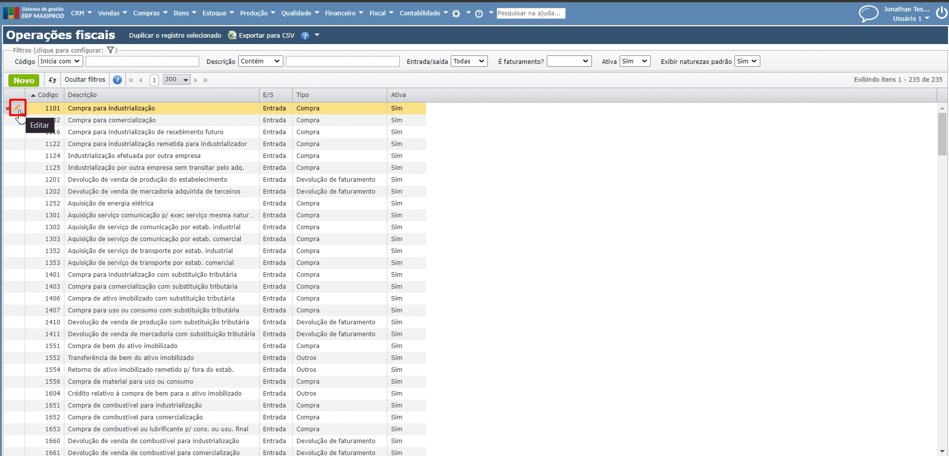 2) Logo após, clique no ícone “lápis laranja” para editar a operação fiscal desejada.