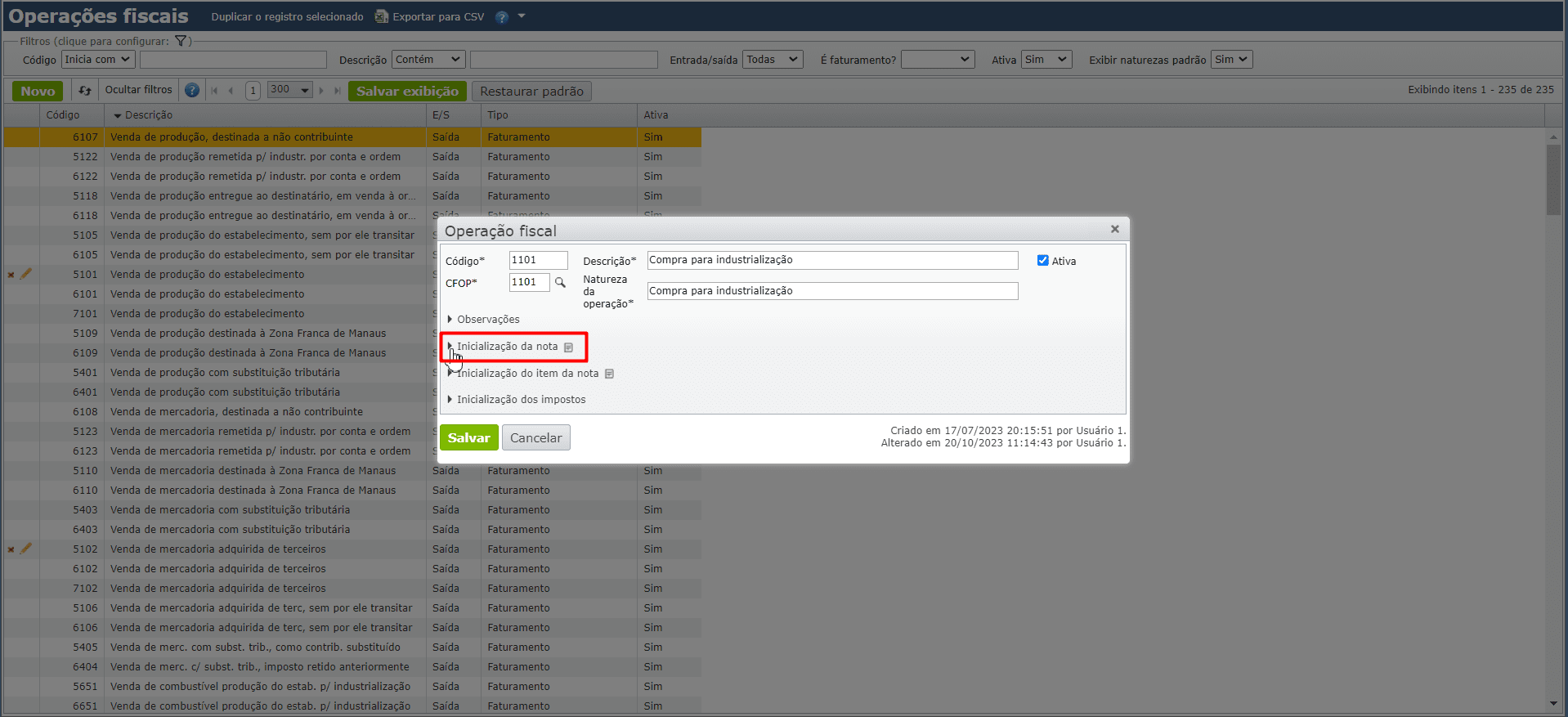 1) Ainda na edição da operação fiscal, exiba a seção “Inicialização da nota“.