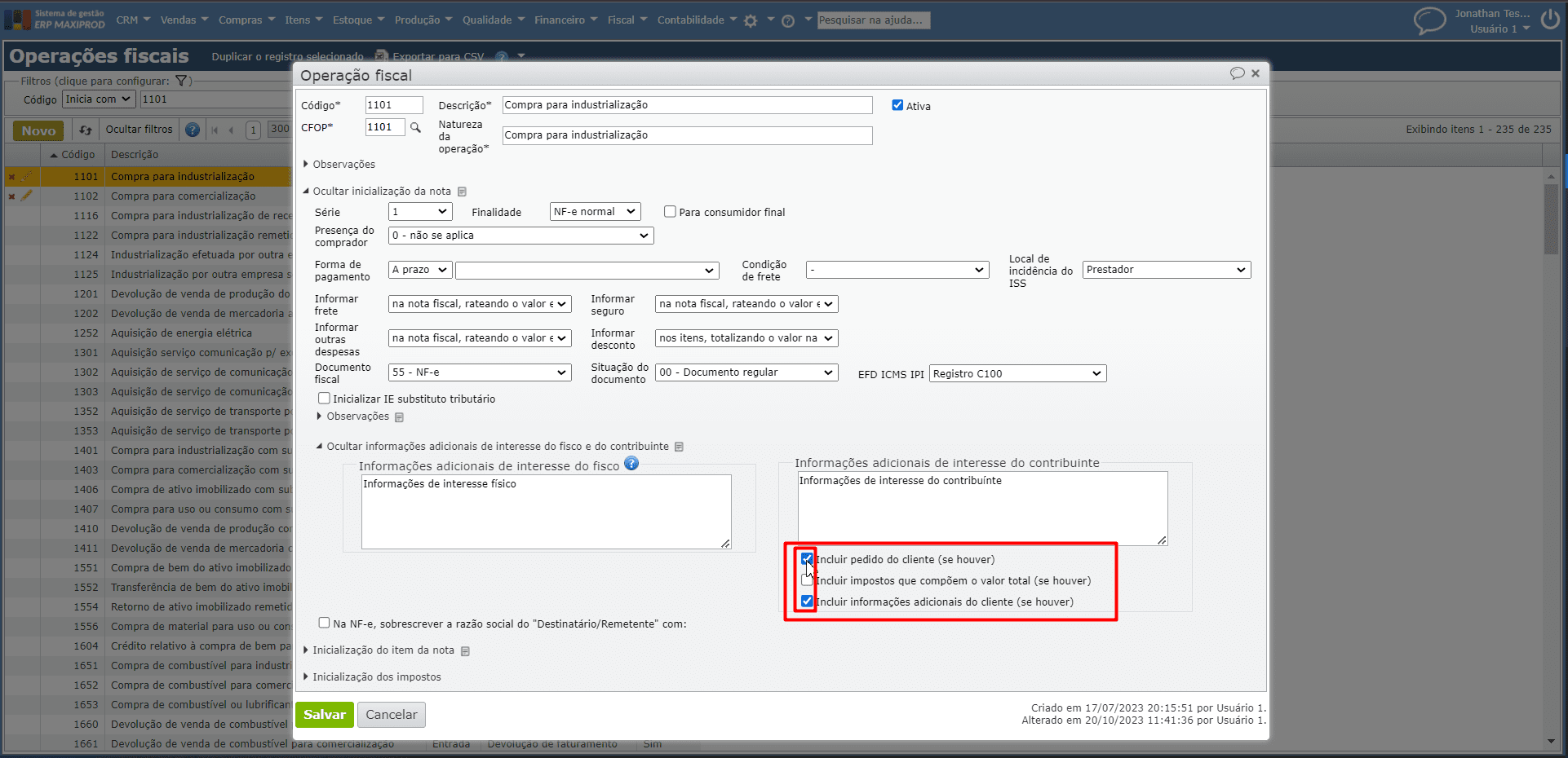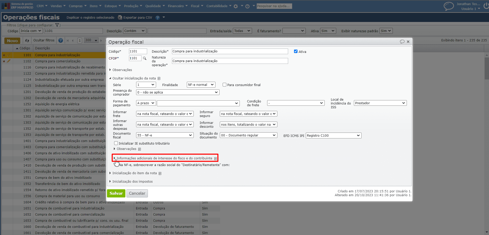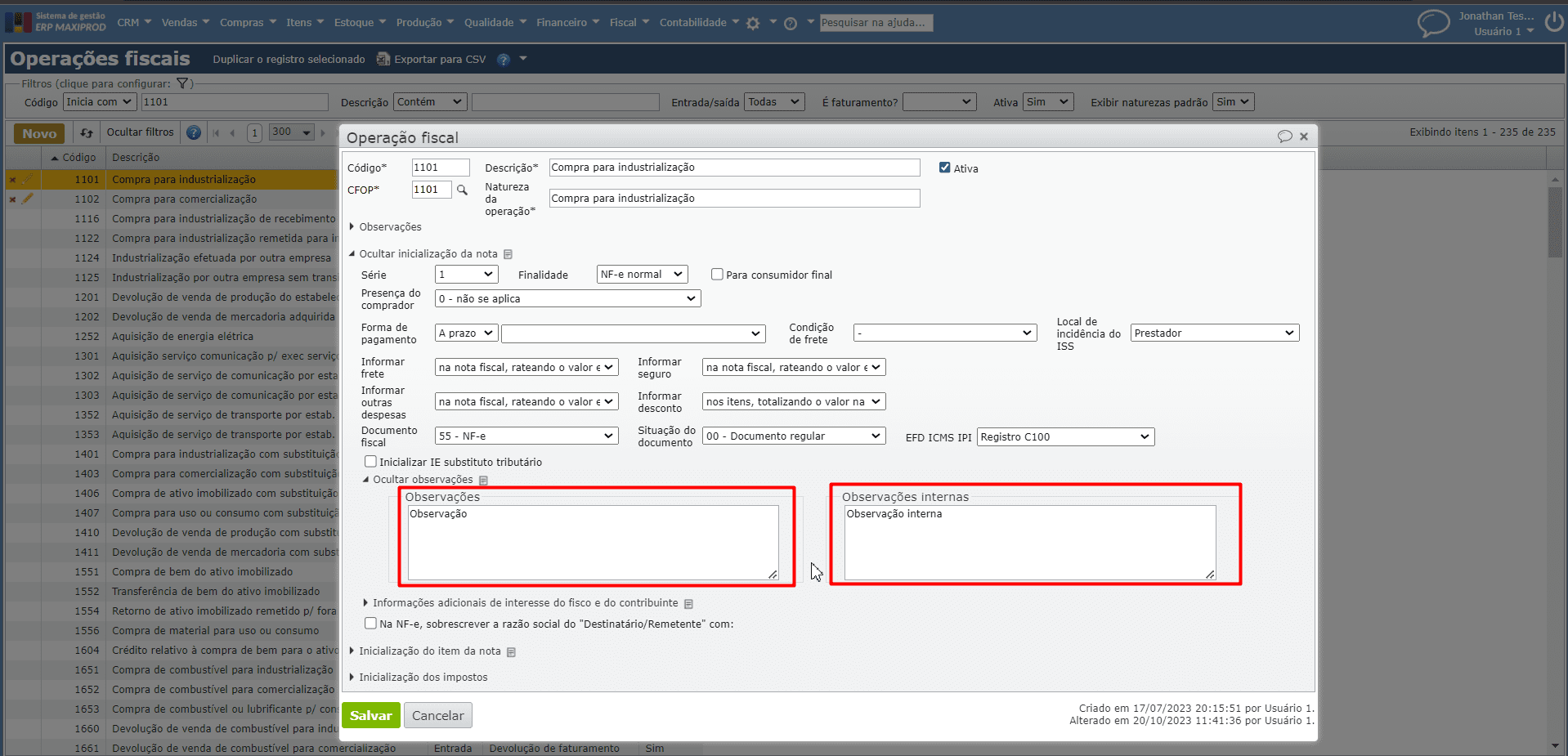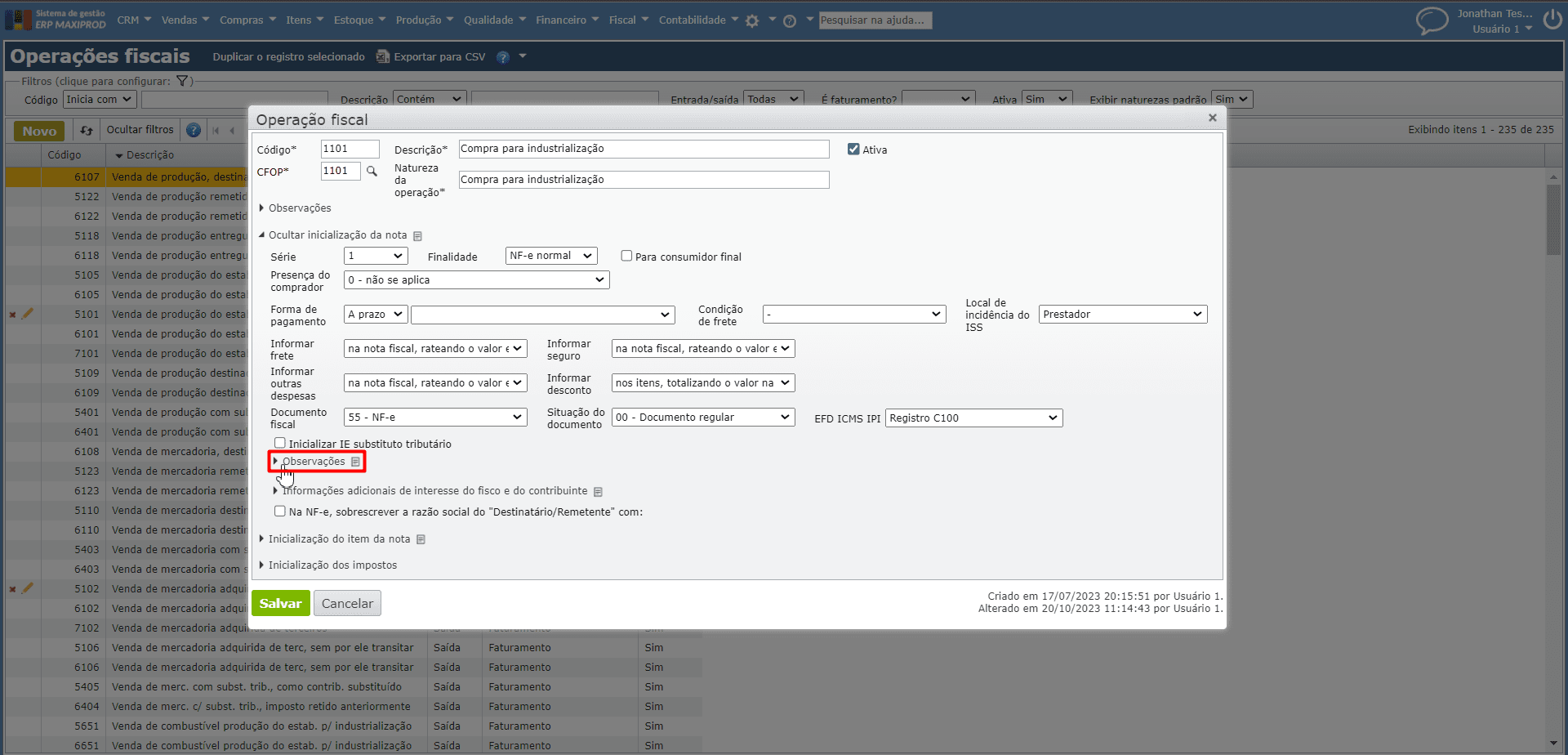 O ERP MAXIPROD permite incluir nas operações fiscais algumas informações adicionais que serão inicializadas nas notas fiscais, como “Observações”, “Informações de interesse fisco” e “Informações de interesse do contribuinte”. Para este passo a passo utilizaremos como base as configurações padrão das operações fiscais do ERP MAXIPROD.