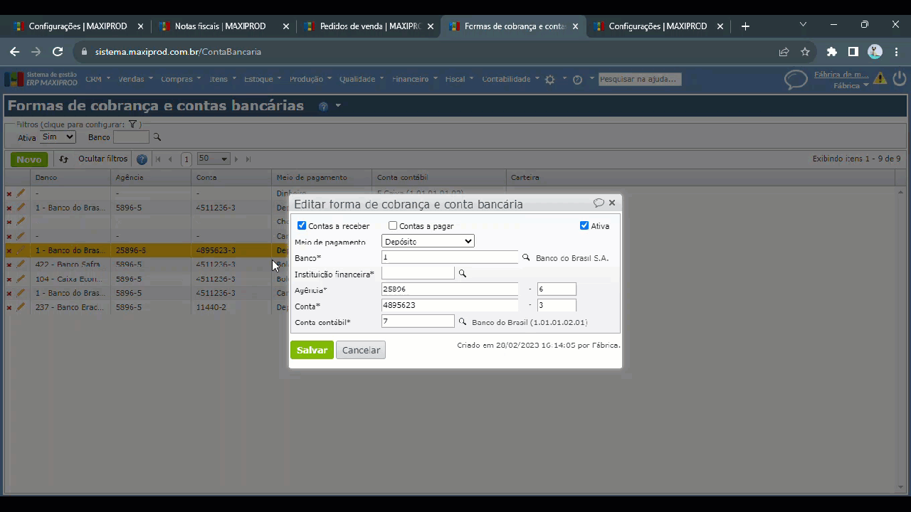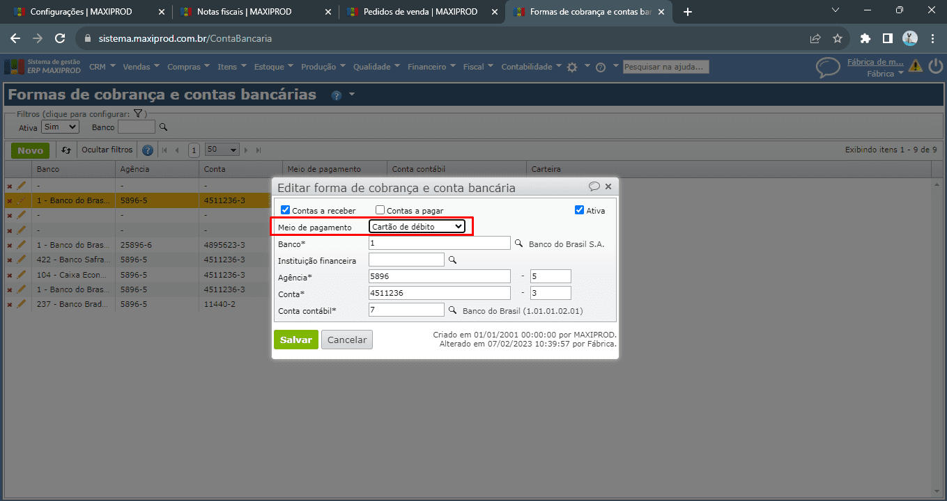 4.1) O meio de pagamento é informado no cadastro da forma de cobrança, em “Financeiro > Cadastros > Formas de cobrança e contas bancárias”.