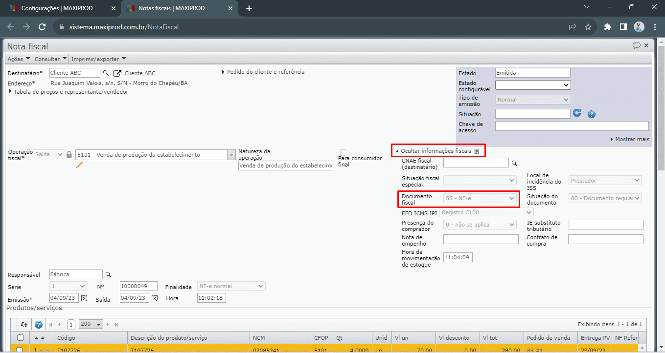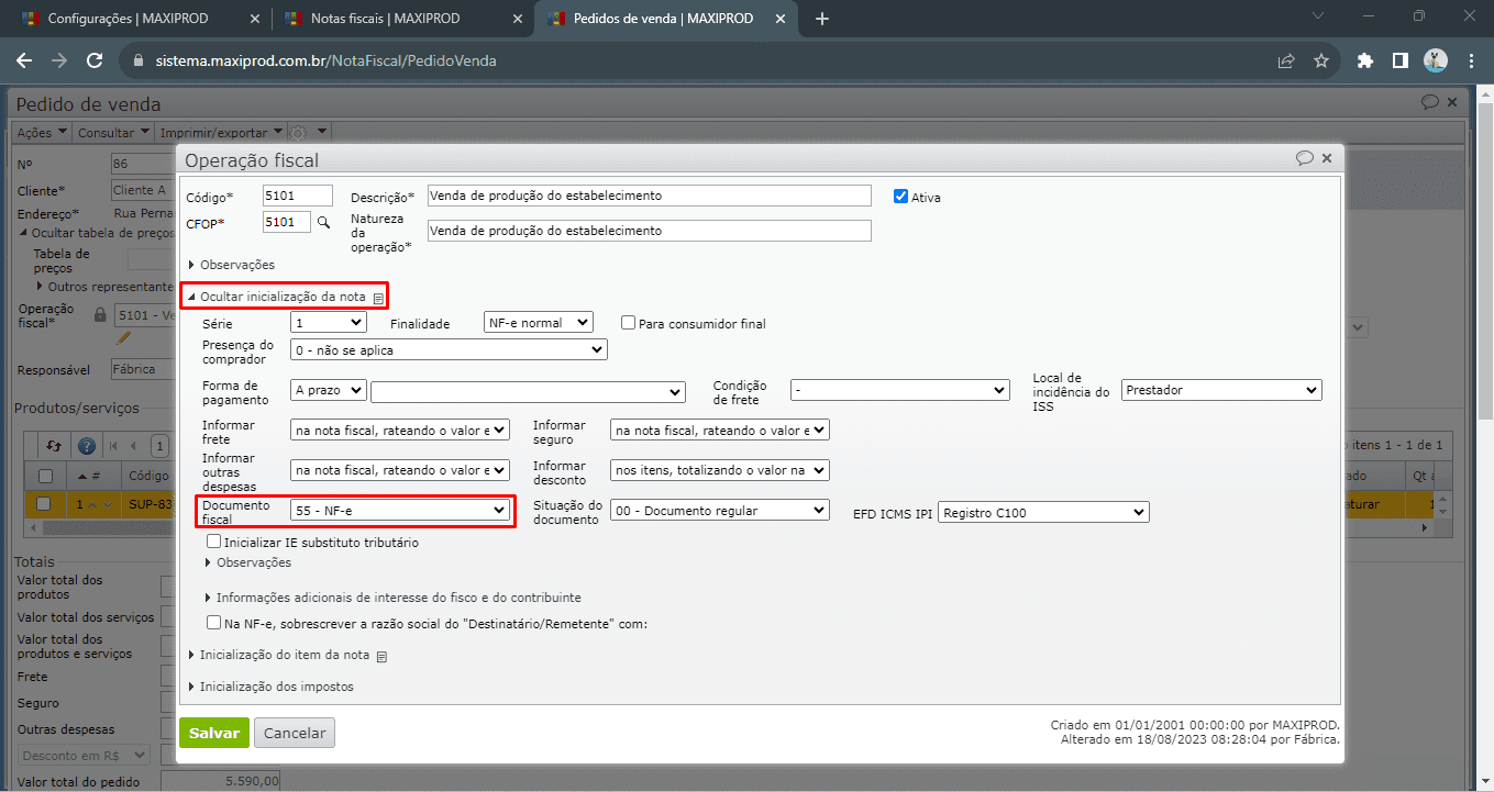 - Na operação fiscal este campo “Documento fiscal” está na seção “Inicialização da nota”.
