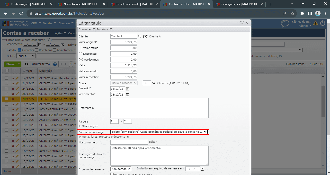 4.3) Na tela de edição dos títulos, o campo “Forma de cobrança” permite ao usuário selecionar uma das opções previamente cadastradas em “Financeiro > Cadastros > Formas de cobrança e contas bancárias”. O sistema considera a opção informada neste campo, e verifica se o meio de pagamento do cadastro da forma de cobrança é eletrônico e se enquadra nos requisitos para a geração do registro 1601 do EFD ICMS/IPI (Sped Fiscal).
