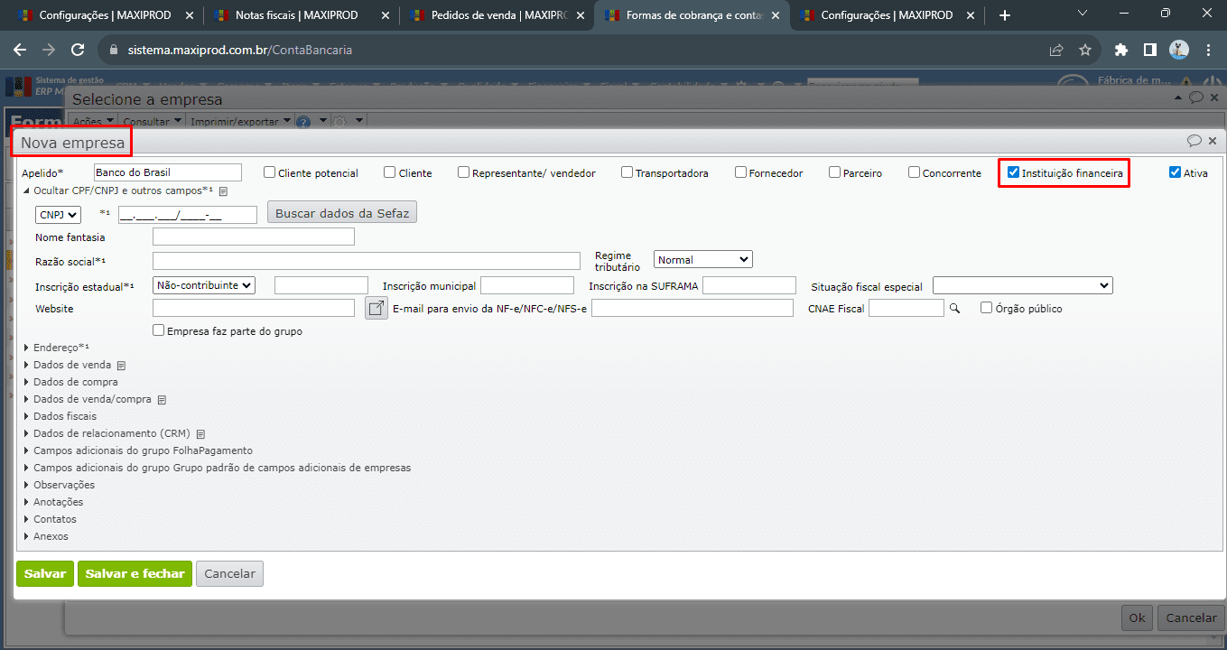 - Preencha os dados da instituição financeira e certifique-se de que a opção “Instituição financeira” no campo “Tipo” está preenchida.