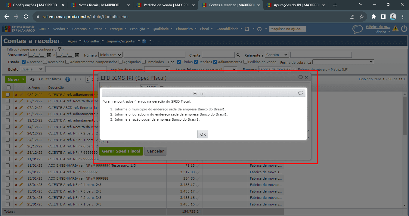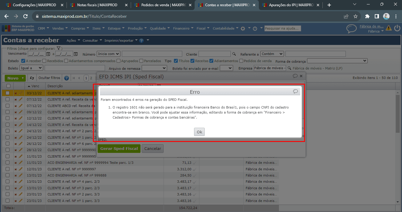 7) Na geração do EFD ICMS/IPI (Sped Fiscal) com o registro 1601, se o campo “CNPJ” do cadastro da empresa, instituição financeira, da forma de cobrança não está preenchido, o sistema retorna a seguinte mensagem de erro: