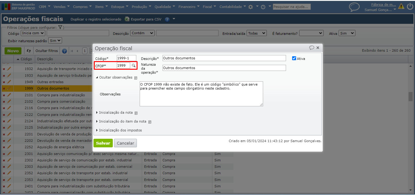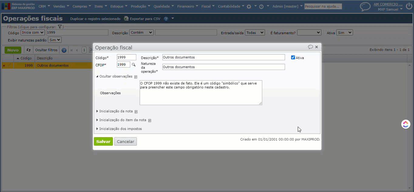 1) No ERP MAXIPROD há quatro operações fiscais com códigos apenas simbólicos, ou seja, não existem CFOPs com estes códigos, portanto, estas operações fiscais servem para documentos fiscais que não exigem CFOP, como as NFs de serviço.