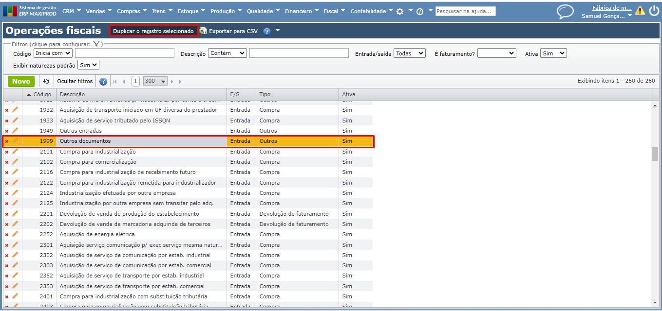 a) Recomendamos duplicar a operação fiscal simbólica, para não perder o registro de origem, que pode ser utilizado em outros documentos fiscais. Para duplicar, selecione a operação fiscal atual, de maneira que sua linha fique alaranjada, e clique na opção “Duplicar o registro selecionado”.
