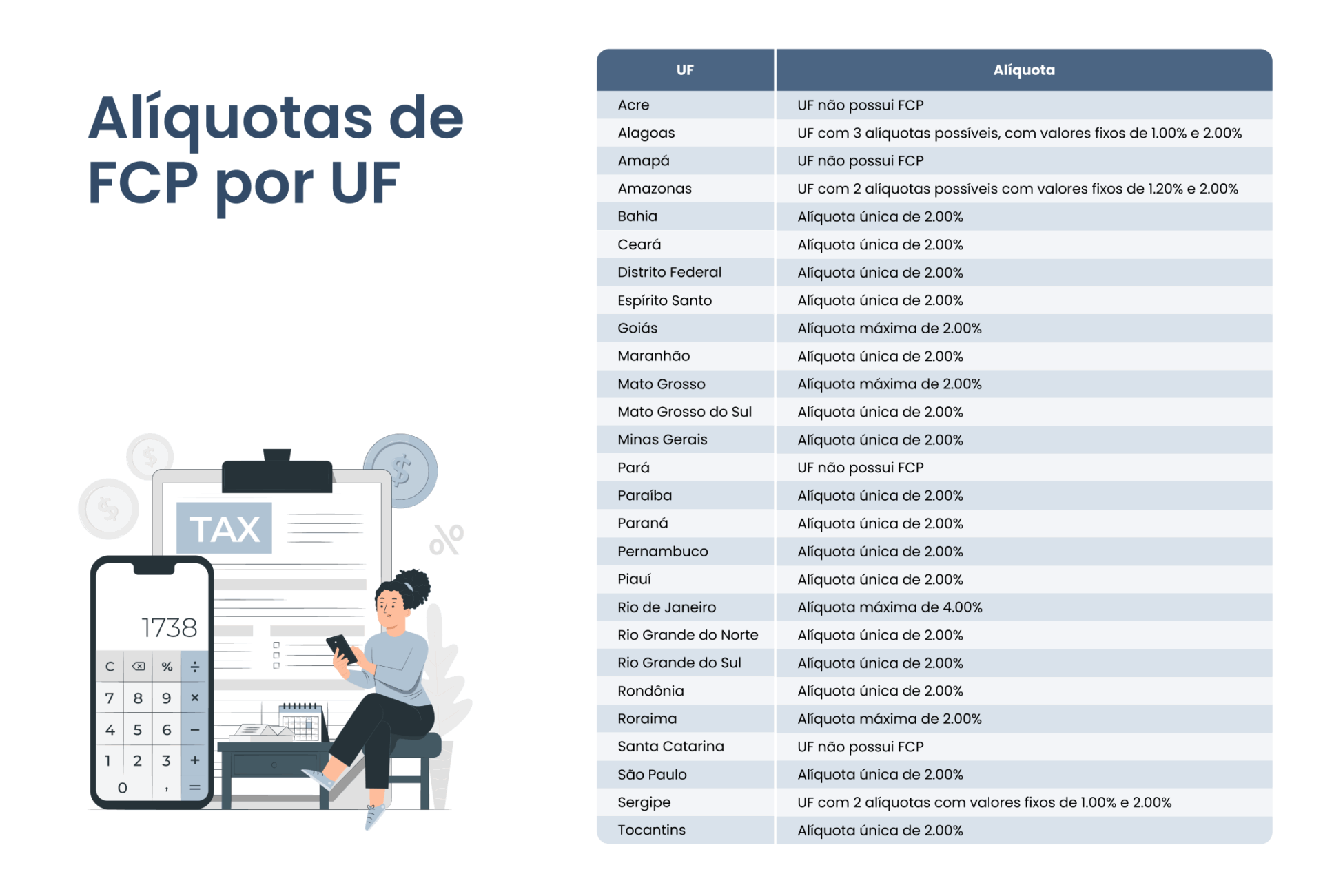 Atualmente, 23 estados e o Distrito Federal aplicam o FCP. Somente 4 UFs não aderiram ao recolhimento do imposto: Acre, Amapá, Pará e Santa Catarina. Todas as outras UFs recolhem o FCP, com alíquotas que variam UF a UF. Veja a tabela do FCP em 2025: