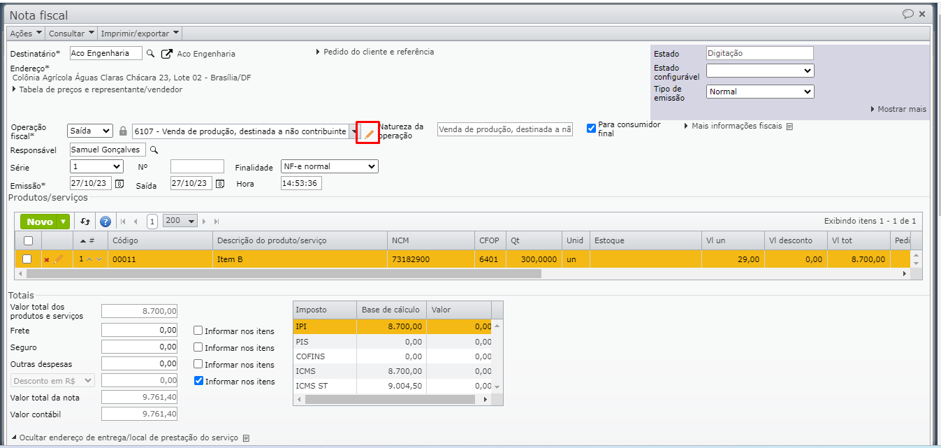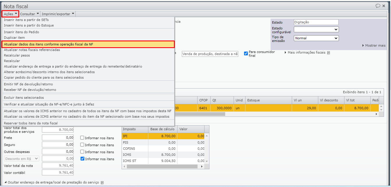 5) Após “Salvar” as alterações na inicialização dos impostos da operação fiscal, acesse o menu “Ações > Atualizar dados dos itens conforme operação fiscal da NF”.