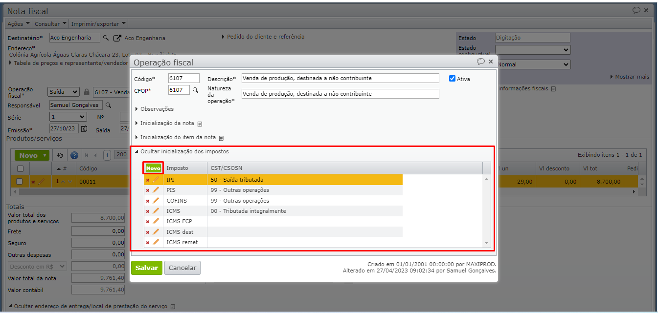 3) Na tela de edição da operação fiscal, expanda a seção “Inicialização dos impostos” e clique no botão verde “Novo” para inserir o ICMS teórico.