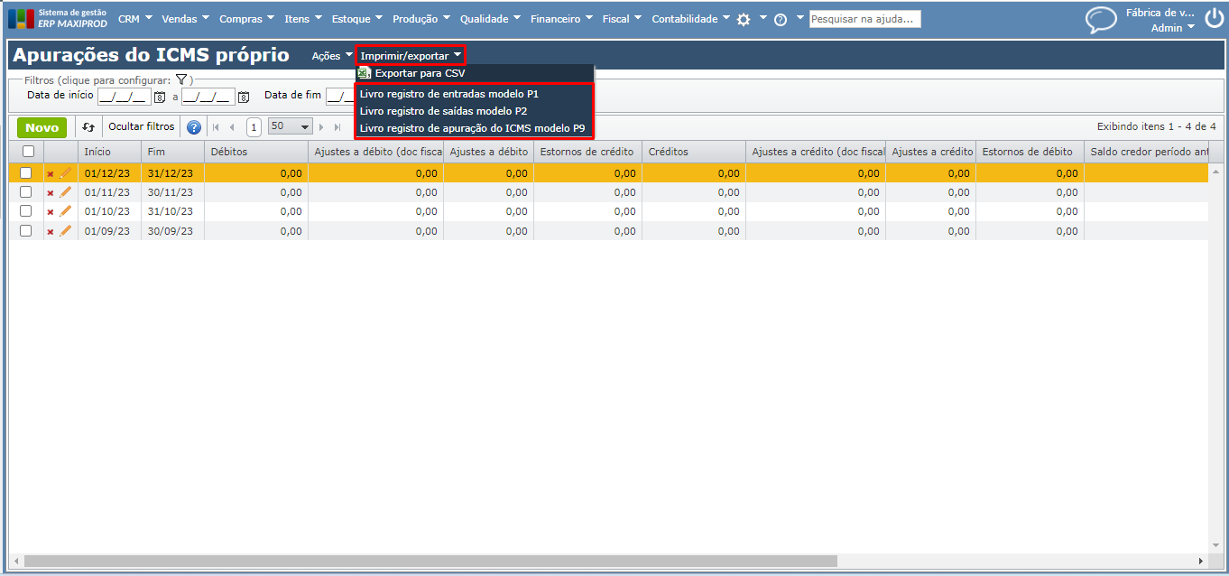 2) Clique sobre a apuração desejada para selecioná-la e, a seguir, acesse o submenu “Imprimir/exportar > Escolha o modelo do livro a ser impresso”. As opções são:
