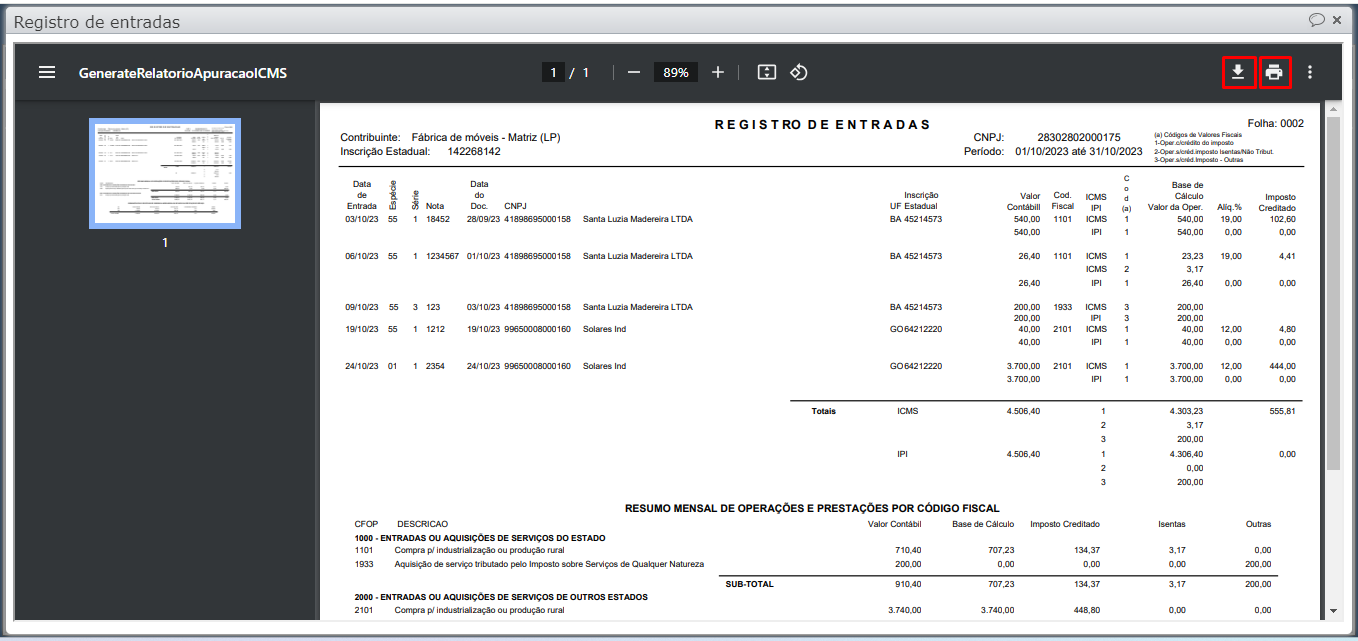 3) É gerada a impressão conforme o modelo escolhido, permitindo ao usuário visualizar em tela, baixar para uma pasta local da sua máquina ou imprimir.
