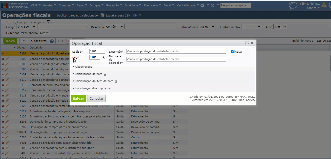 1) Acesse “Fiscal > Cadastros > Operações fiscais” ou clique no ícone do lápis ao lado do campo “Operação fiscal” na edição do documento de venda/compra que estiver editando.