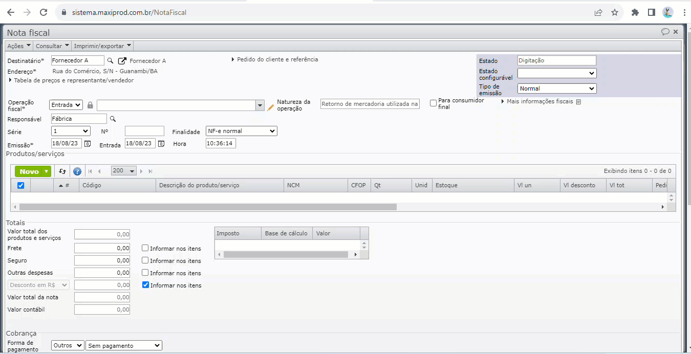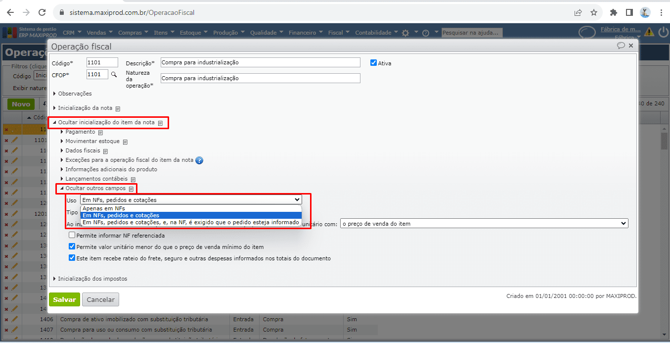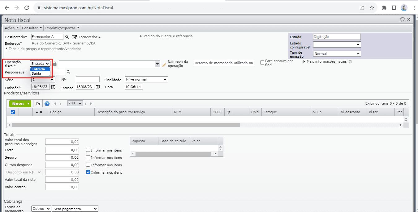 3) Conforme o tipo (entrada ou saída) da operação fiscal consultada, verifique a opção utilizada no campo “Operação fiscal” do documento de venda/compra que está sendo editado.