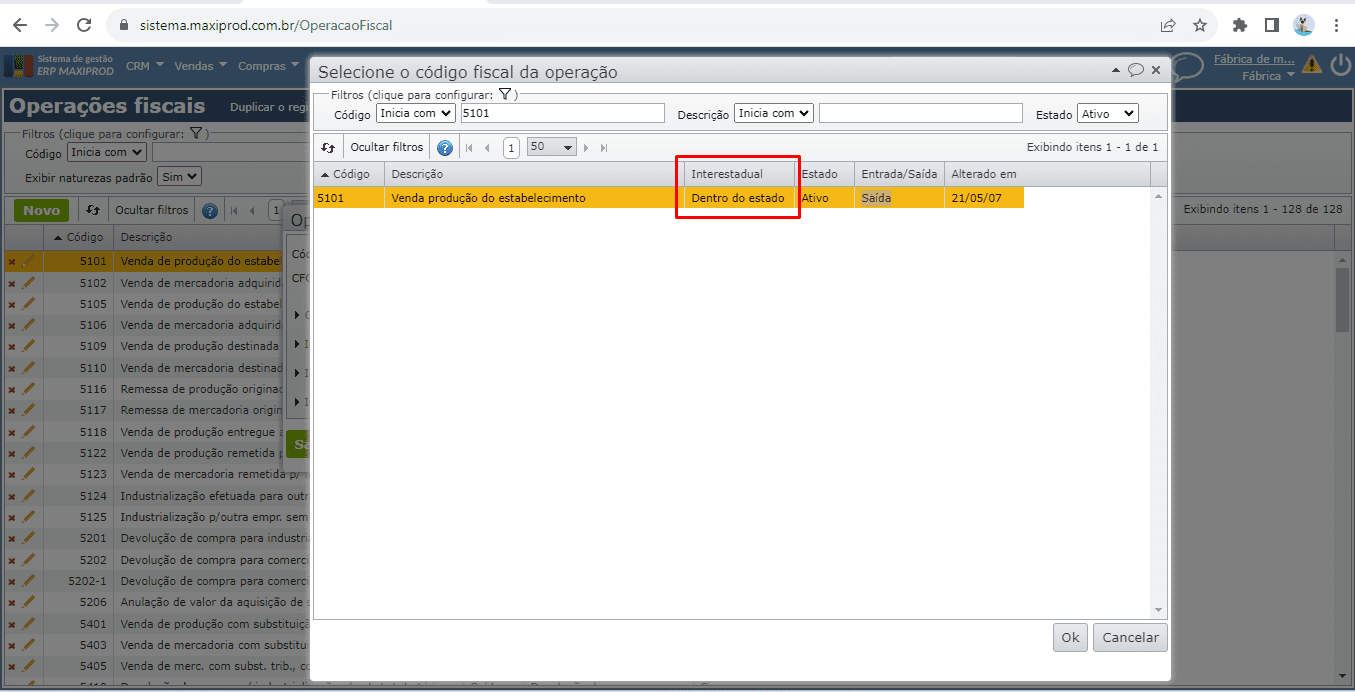 5) Se o tipo (Entrada/saída) da CFOP não for o motivo, verifique a coluna “Interestadual” na lista de CFOPs. Em seguida, veja se o endereço da empresa logada (“Roda dentada > Editar minha empresa”) tem UF igual ou diferente do endereço da empresa utilizada como cliente/fornecedor ou remetente/destinatária do documento de venda/compra.