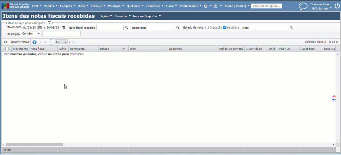 1) Acesse “Compras > Itens das notas fiscais recebidas”.