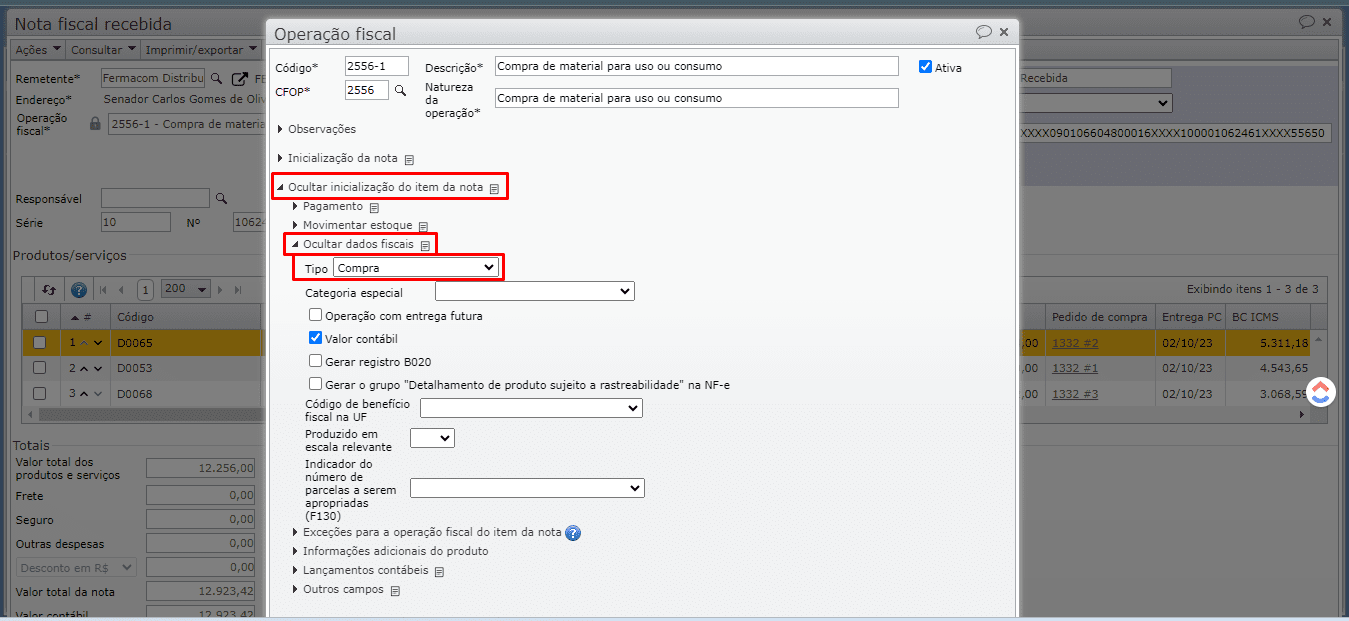 2) Portanto, sempre que houver notas recebidas com o “ICMS Difal comprador” informado, e que deveriam constar na seção “Débitos extemporâneos” da apuração do ICMS próprio, verifique se o tipo da operação fiscal é “Compra”. Para verificar o tipo, na edição da operação fiscal, expanda a seção “Inicialização dos itens da nota” e em seguida a aba “Dados fiscais”. Verifique o campo “Tipo”.