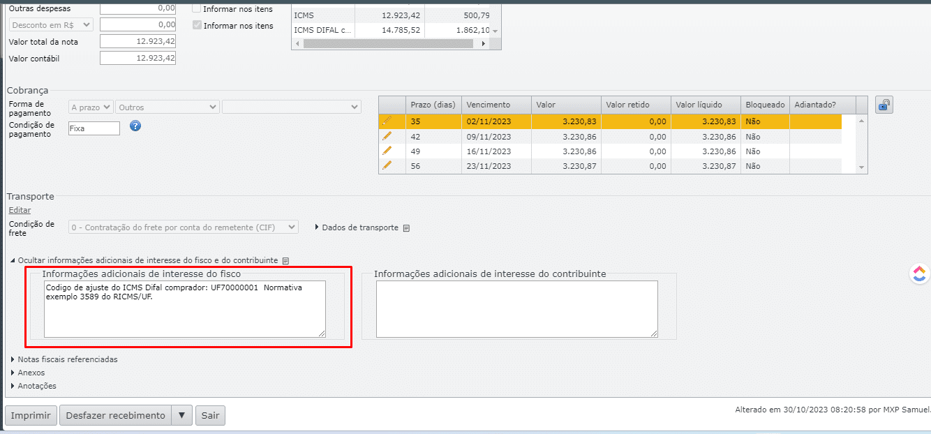 3) Observe o campo “Informações adicionais de interesse do fisco” que deve estar preenchido com a normativa legal que fundamenta a utilização do código de ajuste informado no imposto “ICMS Difal comprador”.